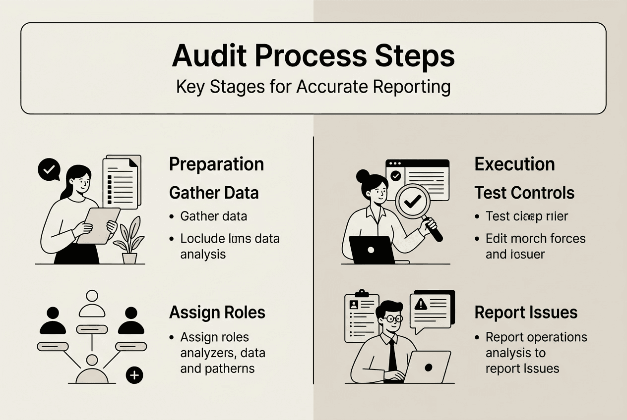 | Control testing | Confirm processes operate effectively | Sample transaction testing, approval verification |